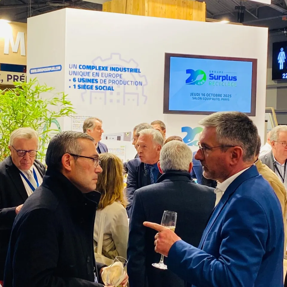 Afin de célébrer ses 20 ans et à l'occasion du salon Équip Auto, le Groupe Surplus Recyclage a organisé une soirée conviviale sur leur stand de 50m² le jeudi 16 octobre, réunissant partenaires et représentants institutionnels.